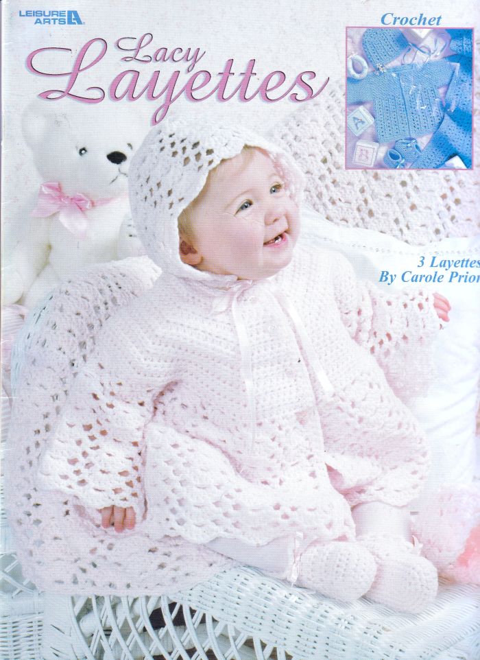 Book of 3 Crochet Layettes including White Lacy, Blue Post Stitch & Pink Lacy in Various Plys for 0-9 months. * US Terms throughout *
